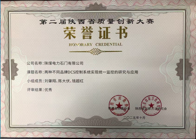 近日,在第二屆陜西省質(zhì)量創(chuàng)新大賽中,陜煤電力石門有限公司申報《兩種不同品牌DCS控制系統(tǒng)實(shí)現(xiàn)統(tǒng)一監(jiān)控的研究與應(yīng)用》榮獲優(yōu)秀獎。《...